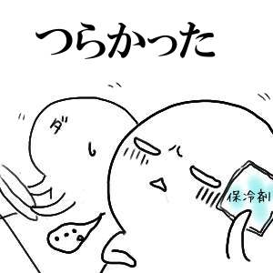 家から持参した保冷剤で冷やしつつ・・・耐えました。